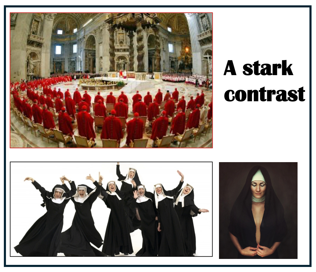 Neither priests nor nuns are allowed to marry or enjoy any of the physical intimacies that relationship implies. But there the similarities diverge. He is allowed power, authority, and outward beauty. She is denied all of that and must, analogously to the birds, humbly endure leftovers.